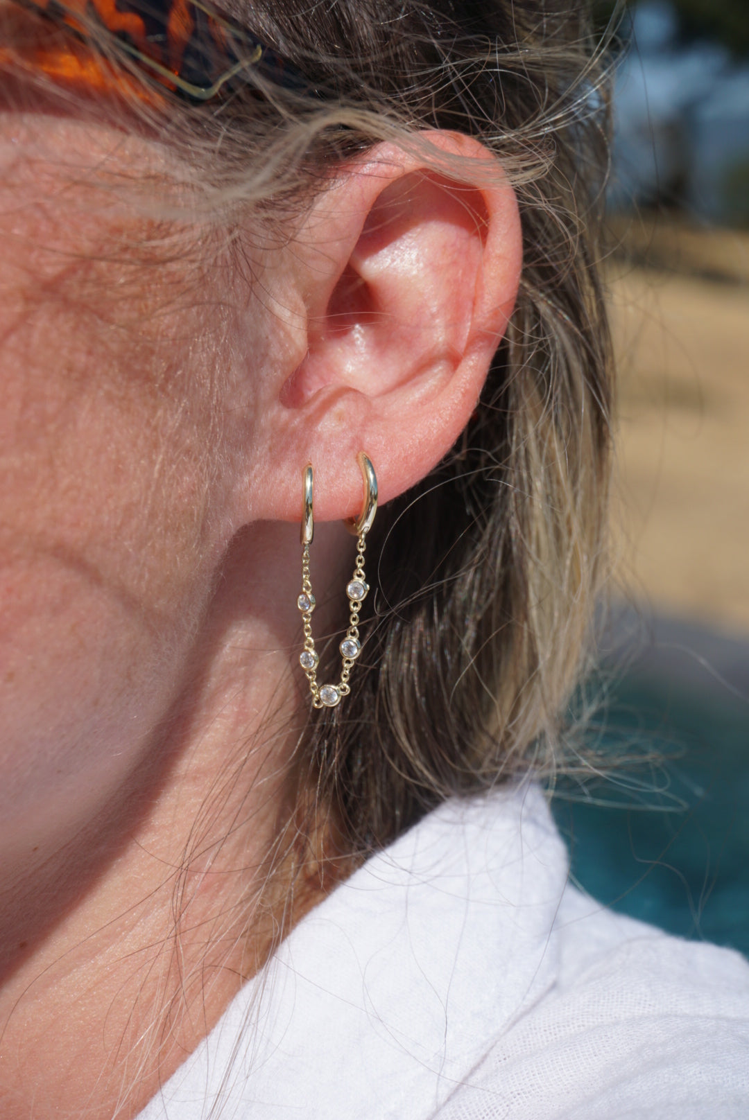 Double huggie hoop chain earrings gold over sterling silver with cubic zirconia (sold as single earring)