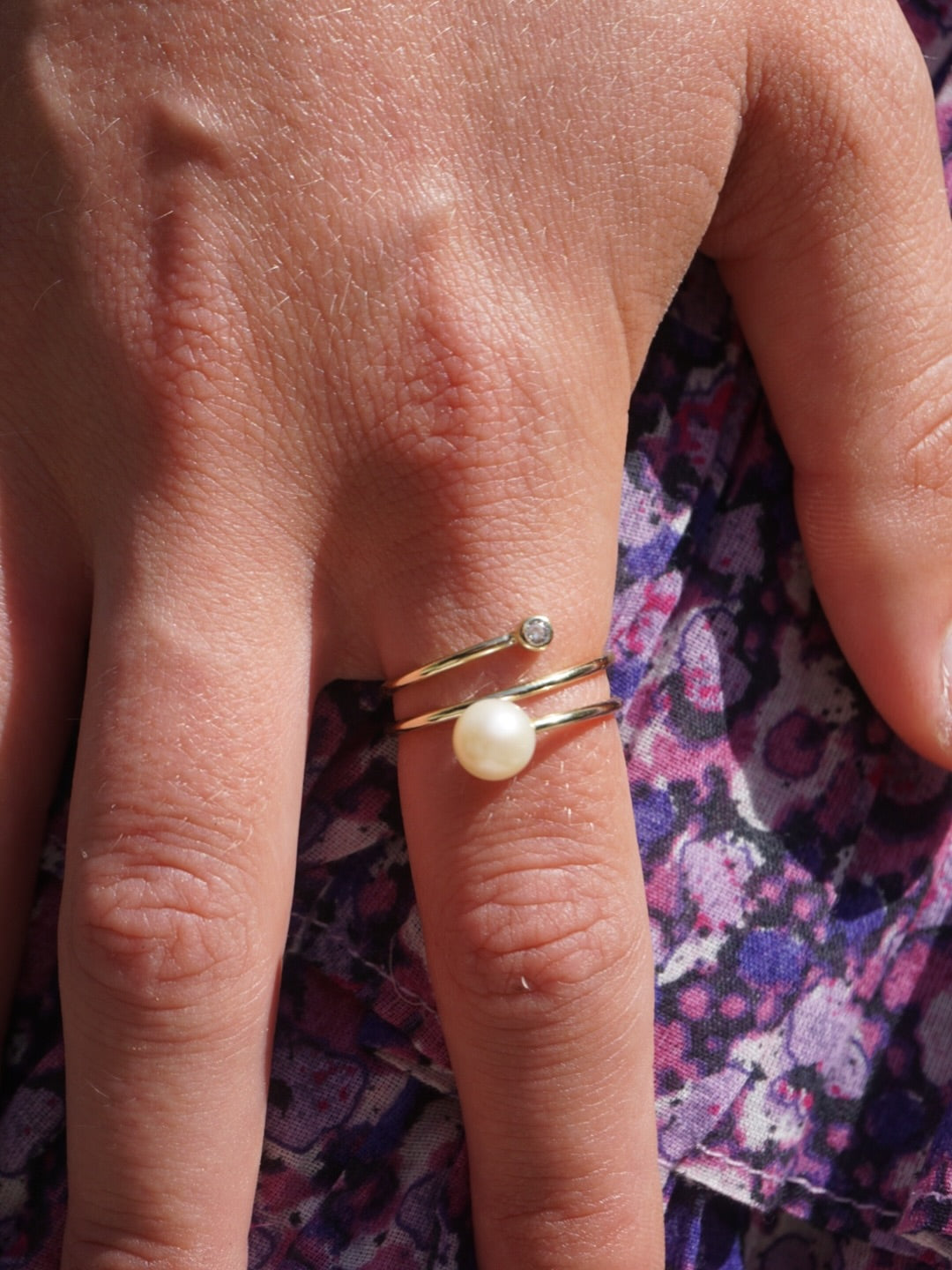 Triple wrap ring, fresh water pearl and cubic zirconia gold over sterling silver
