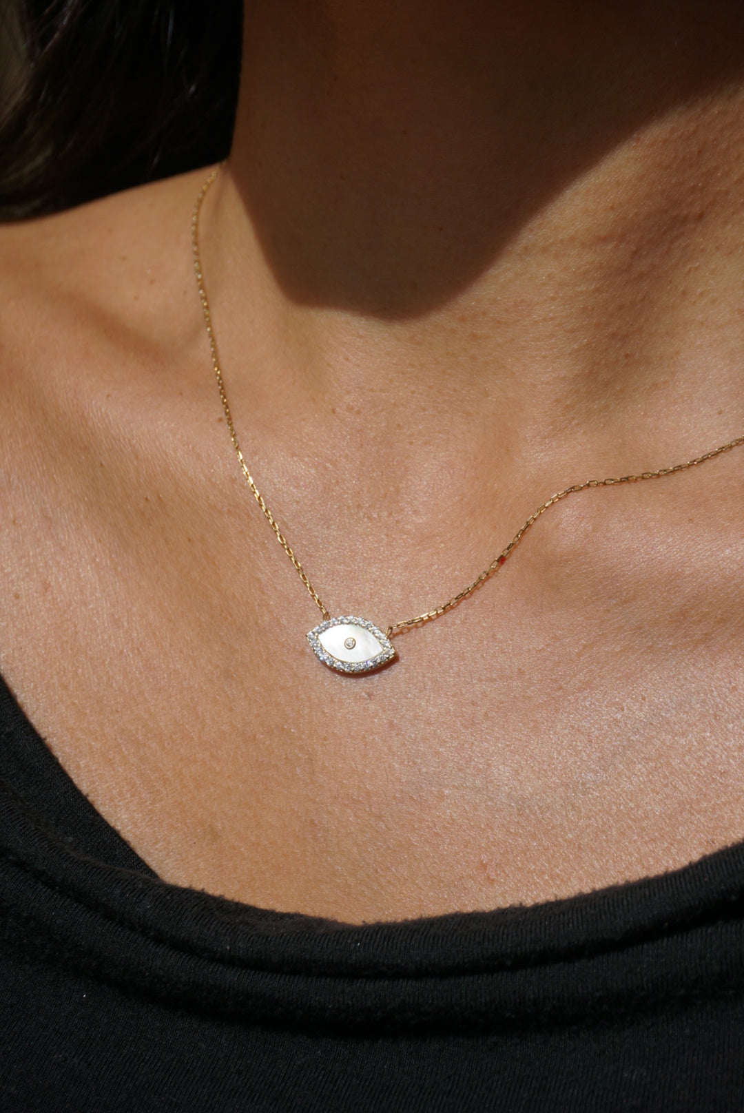 Guardian eye necklace gold over sterling silver with mother of pearl and cubic zirconia