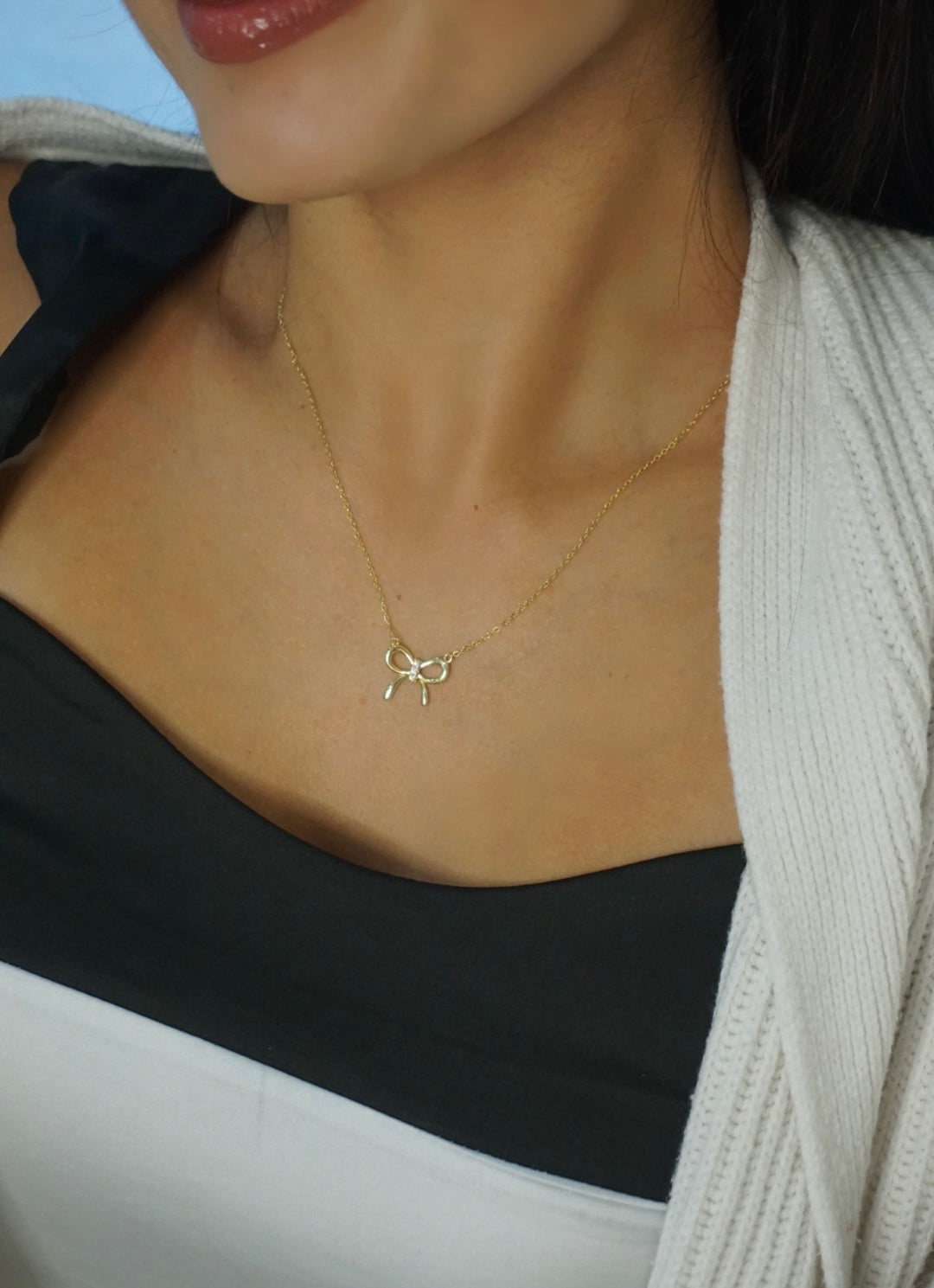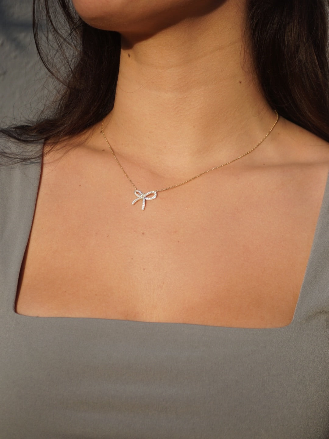 Bow Necklace gold over sterling silver with cubic zirconia 16" + 2"
