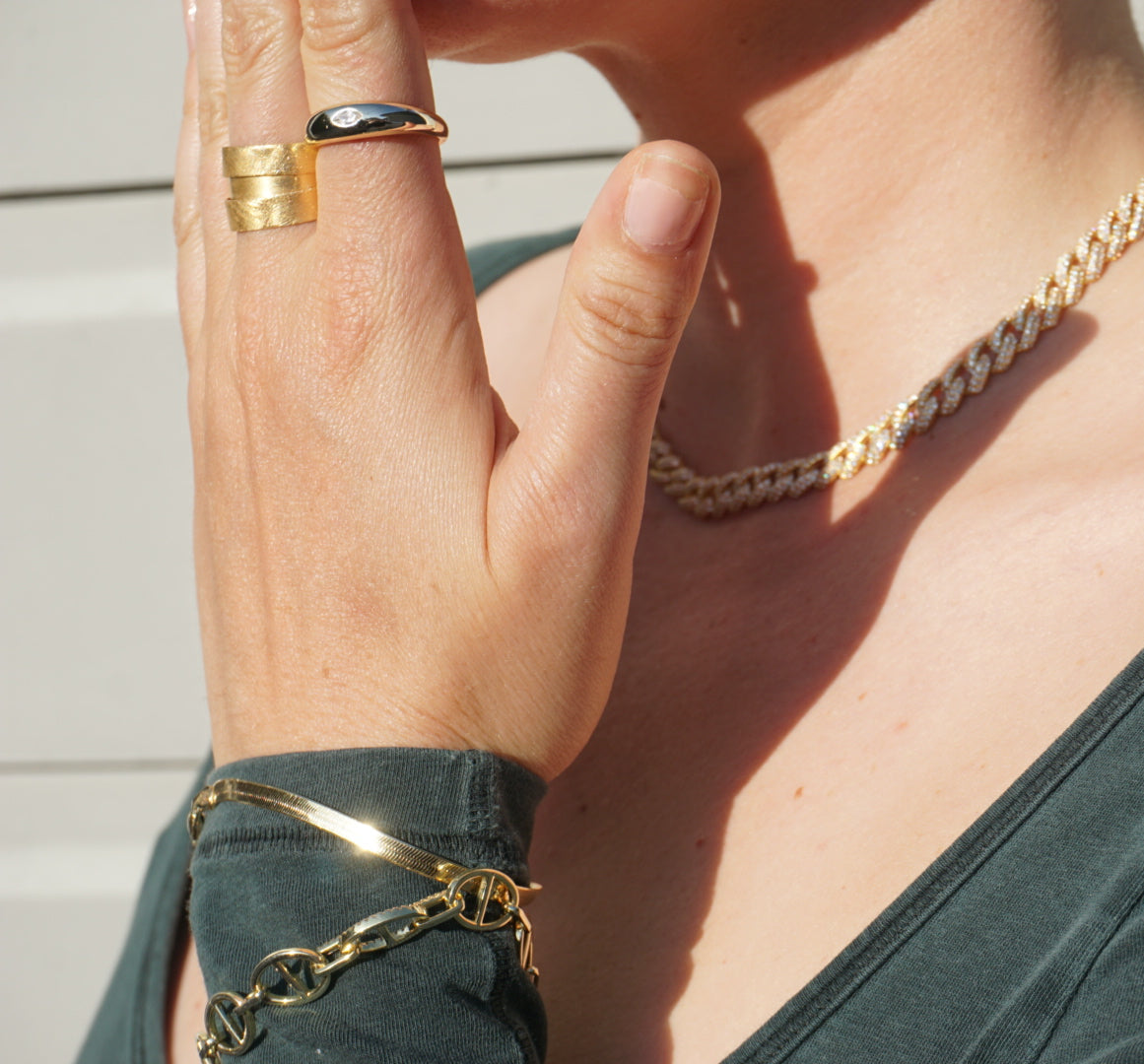 large cuban link ring with cubic zirconia pave gold over sterling silver