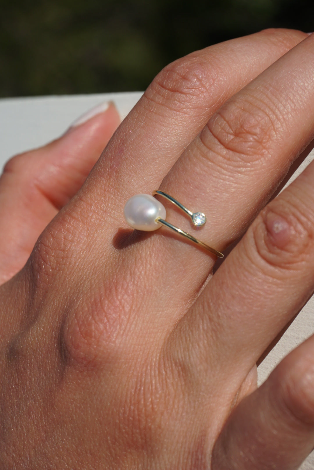 Wrap ring freshwater pearl and cubic zirconia gold over sterling silver